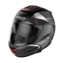 • Hakebeskytterens rotasjons-bevegelse er elyptisk, som gjør det mulig at den totale størrelsen av hjelmen når den står i åpen posisjon, forblir så liten og lav som mulig da den kommer helt inntil hjelmens ytterskall i front. Effekten er vesentlig, når man kjører med hakebeskyttelsen åpen posisjon og man ikke har en «seil-effekt», og fortsatt sikrer god komfort kan nyte følelsen av «halvhjelm».